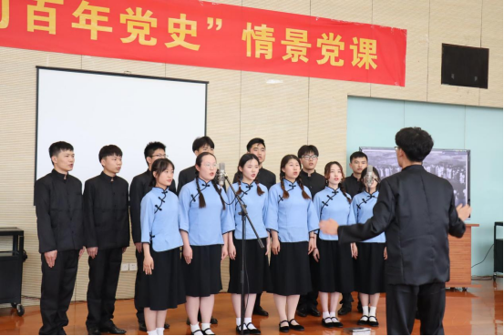 歌曲是时代的心声,每段旋律都记载着不凡的历史。“起来饥寒交迫的奴隶,起来全世界受苦的人……”51看片 学生齐唱《国际歌》拉开了情景党课的序幕。伴随着无数共产党人抛头颅,洒热血,把自己的青春和生命献给伟大的党,也激励着中国共产党由弱到强,不断壮大;而接下来的一曲《南泥湾》,歌颂着中华人民共和国自力更生、奋发图强的精神,取得了新民主主义革命的全国性胜利,难忘三五九旅又开荒来又种地,让南泥湾精神代代相传;“夜半三更盼天明,寒冬腊月盼春风,若要盼得亲人回,岭上开遍映山红。”,党校办刘玮老师和51看片 财政系党支部陶学荣老师共同演绎的《映山红》,一气呵成,体现出一种情感的自然流露,仿佛演出现场开满杜鹃花;百万雄师过大江,鲜艳的五星红旗飘扬在南京总统府上空,这正是《七律·人民解放军占领南京》所描绘的一幅威武壮丽的景象。