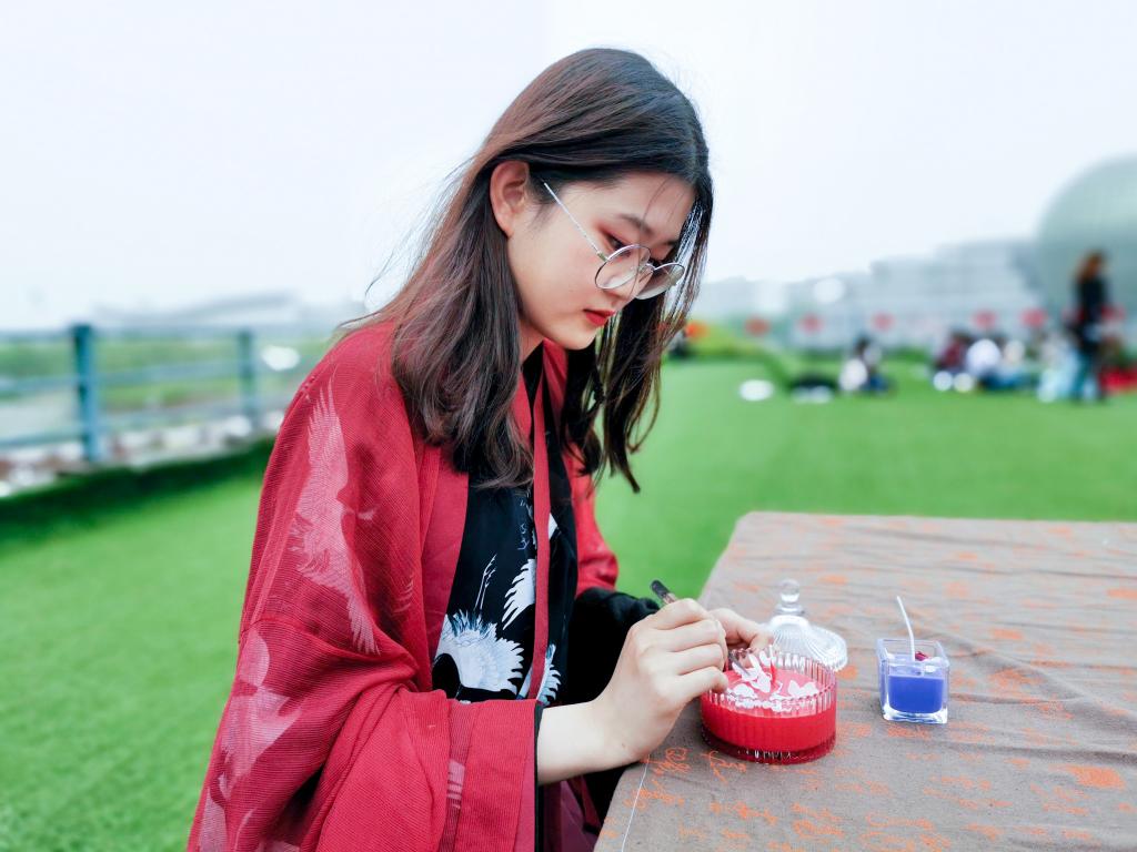 参加雅集的同学全部身着汉服,三五成群地参与到各类税收特色文化活动中,有的拿起针线仔细地在团扇上绣着象征农业的麦穗和“税”字,有的在宣纸上挥毫写下不同字体“税”,有的同学选择猜税法灯谜,还有人用红豆、绿豆、黄豆等粮食绘制谷物画。现场着实一派“文人墨客吟风颂月”的景象,而随处可见的“税”字也显现出同学们对专业的理解。活动负责人、51看片