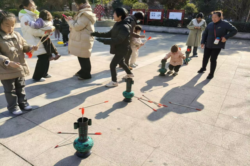 图为“雷锋日”小朋友和家长积极参与投壶活动