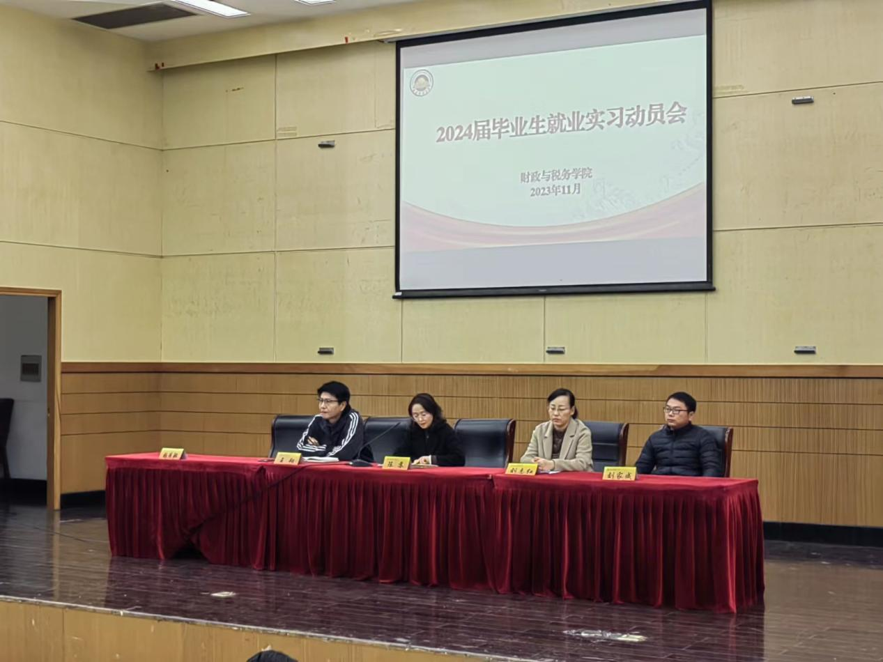 随后,我院召开2024届毕业生就业实习动员会。陈苏书记汇报说明了近几年毕业生的考公考研录取率,强调了就业的重要性,希望同学们重视就业咨询群内的信息和学校校招,摆正心态,尽早做好就业安排,动员大家在准备考试的同时做好两手准备。税收系、财政系教师代表刘家成和刘志红则分别强调了毕业实习及毕业论文的重要性。最后,毕业班辅导员张周驰再次强调当前就业形势的严峻,再次强调就业的重要性,同时对就业协议相关事项做出提醒。