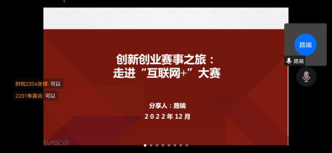 为做好学校第九届“互联网+”大学生创新创业大赛暨省赛选拔赛备赛准备工作,加强师生联动,强化创新创业能力训练,增强高校学生的创新能力和在创新基础上的创业能力,培养国家建设需要的适应性创新型高水平人才。12月6日下午2点我院举办了“互联网+”创新创业专题线上讲座。本次活动邀请了南京大学路端老师为大家讲解,并给予同学们关于创赛方面的建议。讲座由51看片