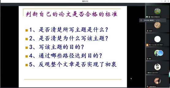 窦清红博士在讲座的第二部分,对论文写作规范进行了全面深入的讲解。首先,窦博士对论文的格式和正文的写作步骤进行了阐述,为我们清晰罗列出了具体的写作框架和相应的写作要点;其次,她提出了撰写论文的基本程序:拟写作品提纲、撰写初稿和修改定稿三个基本步骤,并对每一步骤的基本要求与可能出现的问题进行了分析说明;最后,窦博士讲述了好论文所具备的基本要素与判断自己论文是否合格的基本标准,并强调了论文的主要写作技巧:突出主题、善于取舍和逻辑性。