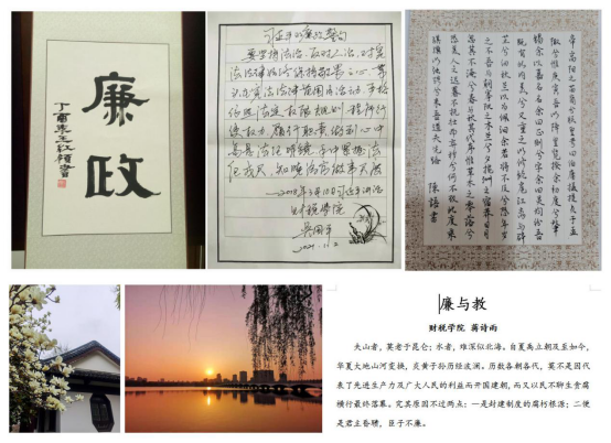 本次征集活动共收集到来自全院师生50余份参赛作品,既包括书法、绘画、文学作品,也包括摄影、朗诵等新媒体形式作品,内容丰富、形式多样。学院税务系党支部吴国平副教授以硬笔书法写下习近平总书记的廉政警句,发人深省;财政系党支部李婧副教授则以“心向阳光不染尘,便是人间好风景”为灵感,捕捉下石头城傍晚的动人瞬间;殷立荣老师以“莲之出淤泥而不染”为题创作的国画,描绘出莲花的高雅,栩栩如生;学院青年教师蒋诗雨则动之以情,写下《廉与教》一文,“‘廉’者,既可作‘刚正’,亦可谓‘廉洁’”、“我们无论身处何位,都必须把正直廉洁铭刻心中,才能身正言直。”,表达自己的廉洁决心;税收2003刘英雪同学和财政2002何羿锋同学则共同合作,以饱含深情的朗诵,表达了自己对廉洁文化的理解。