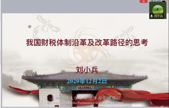 、公共财政研究中心邀请,上海财经大学公共经济与管理学院院长、中国卫生经济学会副会长、全国高校财政学教学研究会副理事长、中国财政学会理事、上海市曙光学者刘小兵教授通过腾讯会议进行了题为“我国财税体制沿革及改革路径的思考”的线上学术报告。院长朱军教授主持了本次讲座,我院部分教师和全体硕士研究生参加讲座。