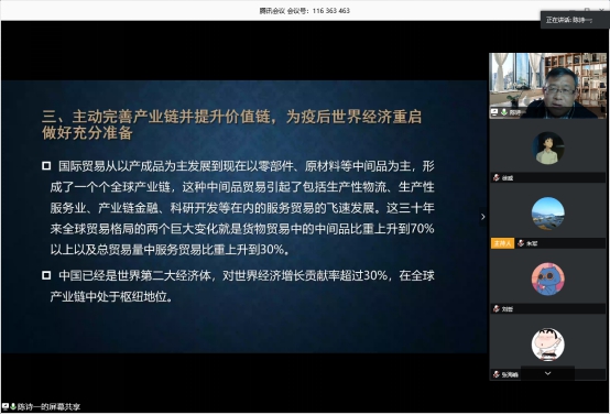 、公共财政研究中心邀请,复旦大学经济学院党委书记、复旦大学泛海国际金融学院党组织书记、复旦大学可持续发展研究中心主任、香港中文大学和复旦大学共建的沪港发展联合研究所联席所长、复旦大学生态环境人文社科领导小组联合组长,博士生导师陈诗一教授通过腾讯会议,为学院师生作了题为“后疫情时期我国宏观经济形势分析”的线上学术讲座。学院部分教师和硕士研究生参加了讲座。