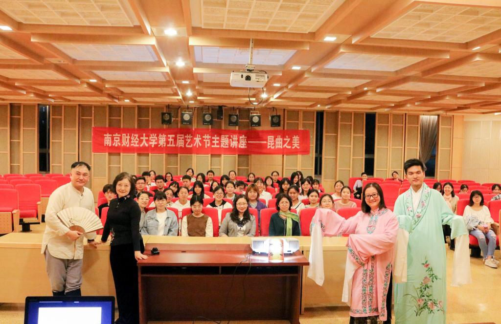 党委副书记李慕原主持,主讲人王斌是江苏省演艺集团歌剧舞剧院艺术指导,原任昆剧院副院长,导演,国家一级演员,国家文华导演奖得主。他在讲座的一开始,便将昆曲的欣赏心,归结为“拿得起,放得下,想得开”三大要素,强调应通过这种欣赏心升华审美,敏锐感知。随后,他就“不到林园,怎知春色如许”这句词示范表演,赢得现场观众的掌声与喝彩。为了使在座师生理解昆曲程式,王斌以动漫视频“粉墨宝贝”形式为大家介绍了生、旦、净、末、丑,并亲自示范四功五法。并邀请助演嘉宾施立群老师合作演唱牡丹亭,歌声余音绕梁将现场气氛推向高潮。王老师表示:“舞台源于生活。在扮演各色角色后,我才明白,生活中不必纠结于开心与难过,加强自身对抗负情绪的能力来营造美好的生活环境才尤为重要”。