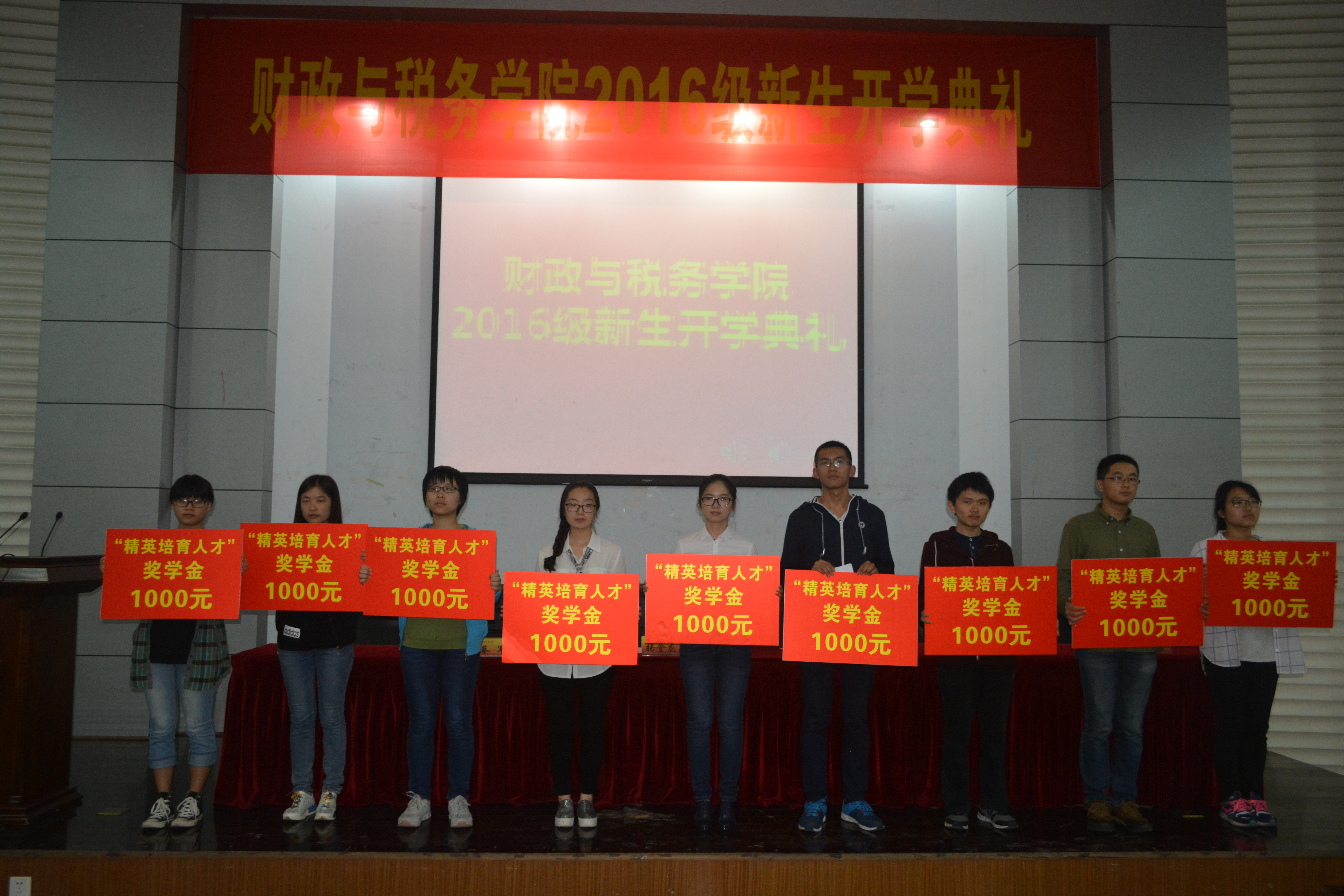 精英人才培育奖学金”颁奖仪式在经济学科楼报告厅隆重举行。2016级全体大一新生参加了开学典礼。院长李林木、党委书记张金龙、党委副书记陈苏、副院长管永昊、院学术委员会主任蔡军、税务系主任程瑶、2016级辅导员李玲等出席。开学典礼由学院党委副书记陈苏主持。