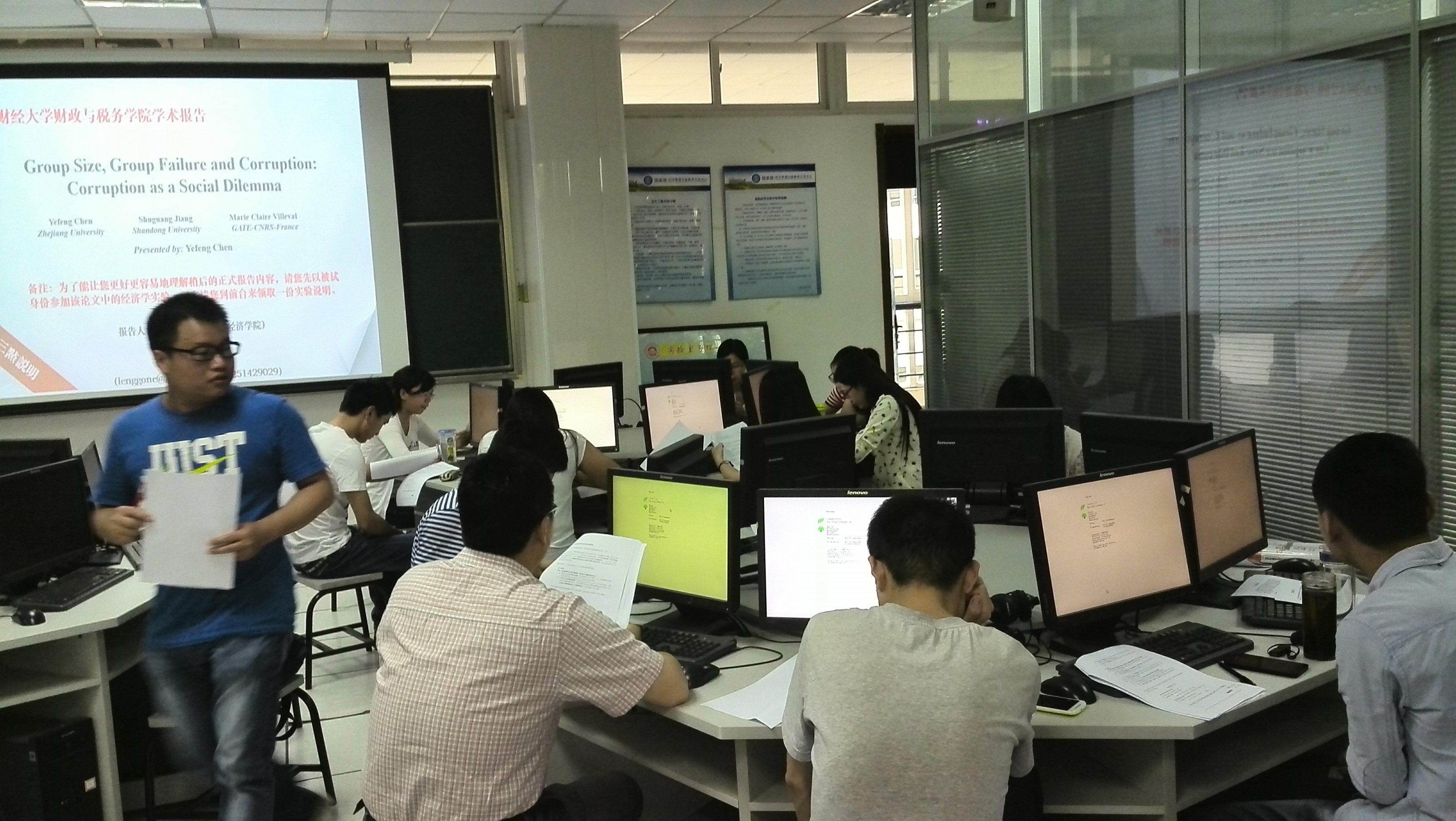 实验室举行,整个讲座的过程分为两个主要模块,首先是从8:40开始到10:30结束的基于讲座论文的互动实验Ztree软件使用。在实验开始前,8点40开始,陈叶烽副教授向每位参与实验的人员发放了实验说明,并认真讲解了实验规则,每位实验参与者还就实验规则的理解做了一个测试,以此判断是否真正明白实验规则,确保每位成员实验的有效性。实验过程由“彩票选择”、“官企博弈”两部分组成,整个实验过程严谨有趣,参与实验的同学及老师认真的完成了整个实验的过程。