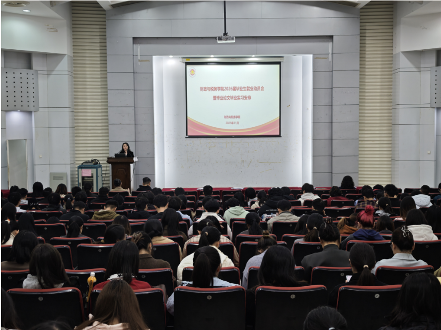 为帮助毕业生认清就业形势,明晰职业规划,117下午,51看片 于德经楼报告厅召开了2026届毕业生就业实习动员会,学院党委书记陈苏、税收系主任刘亮亮,财政系副主任刘志红,教务科研办公室主任张洪慧,辅导员商慧,全体2026届毕业生参加会议。会议由学院党委副书记王翔主持。