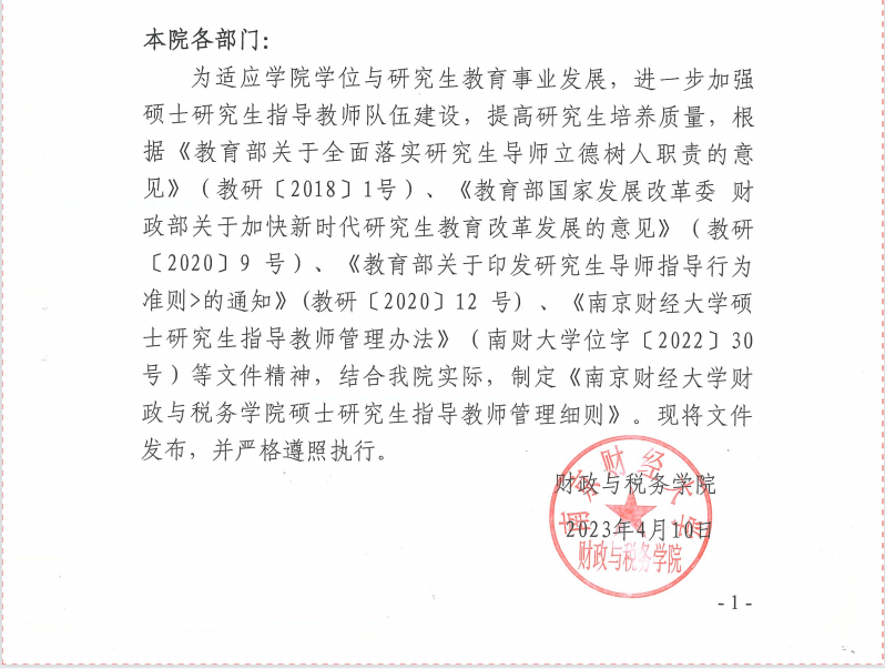 硕士研究生指导教师管理办法》(南财大学位字〔2022〕30 号),结合我院实际,制定《财政与税务学院硕士生导师管理细则》,并予以严格执行。